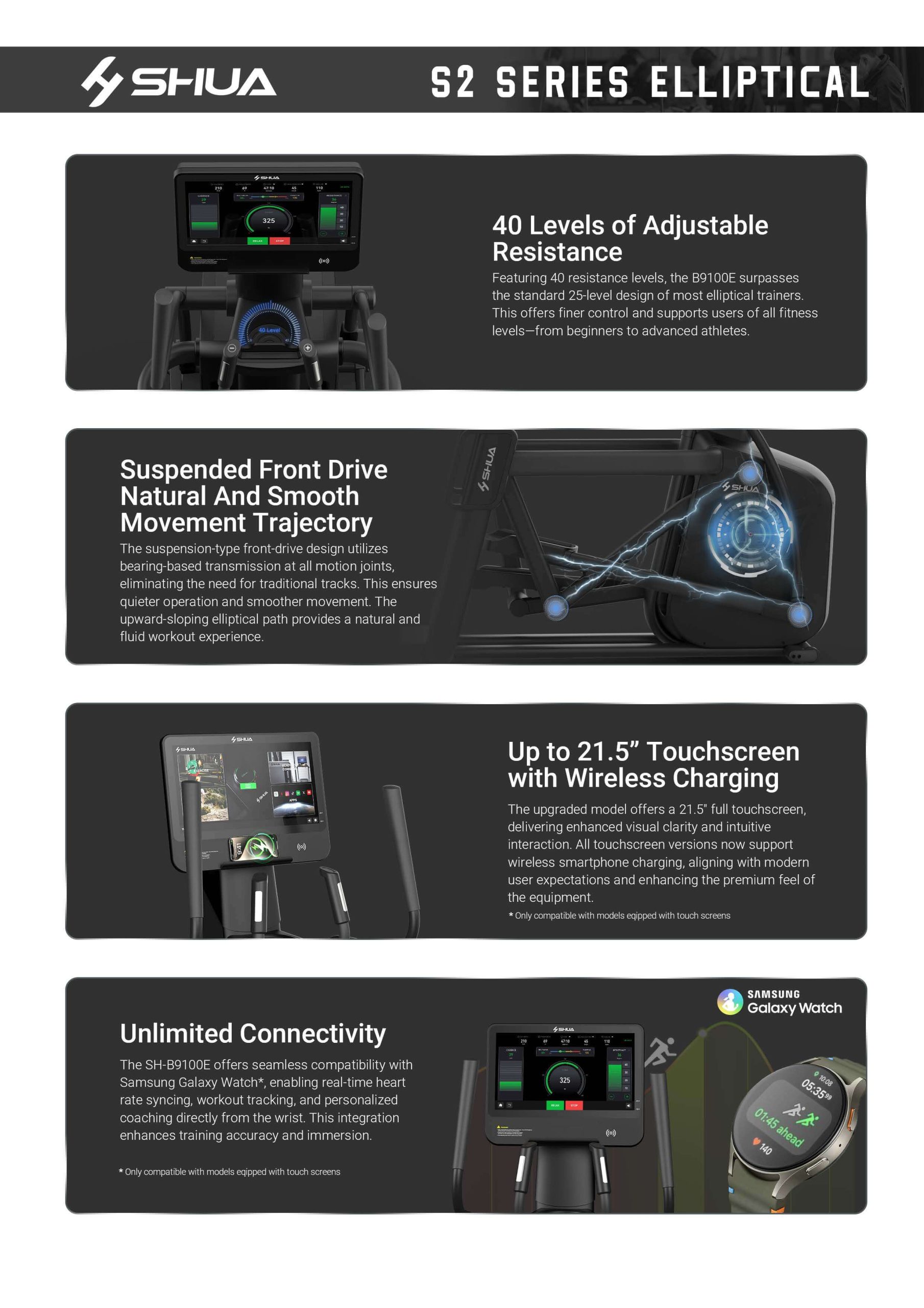 เครื่องเดินวงรี SH-B9100ET มาพร้อมคุณสมบัติที่ทนทาน การเคลื่อนไหวที่เป็นเอกลักษณ์ หน้าจอใช้งานง่าย มอบประสบการณ์การออกกำลังกายที่น่าตื่นเต้นและมีประสิทธิภาพ ด้วยรูปลักษณ์ที่โฉบเฉี่ยวและสง่างาม จึงดึงดูดใจผู้ที่กำลังมองหาเครื่องออกกำลังกายแบบคาร์ดิโอสำหรับทุกระดับความฟิต พร้อมการออกกำลังกายแบบแรงกระแทกต่ำทั่วร่างกาย