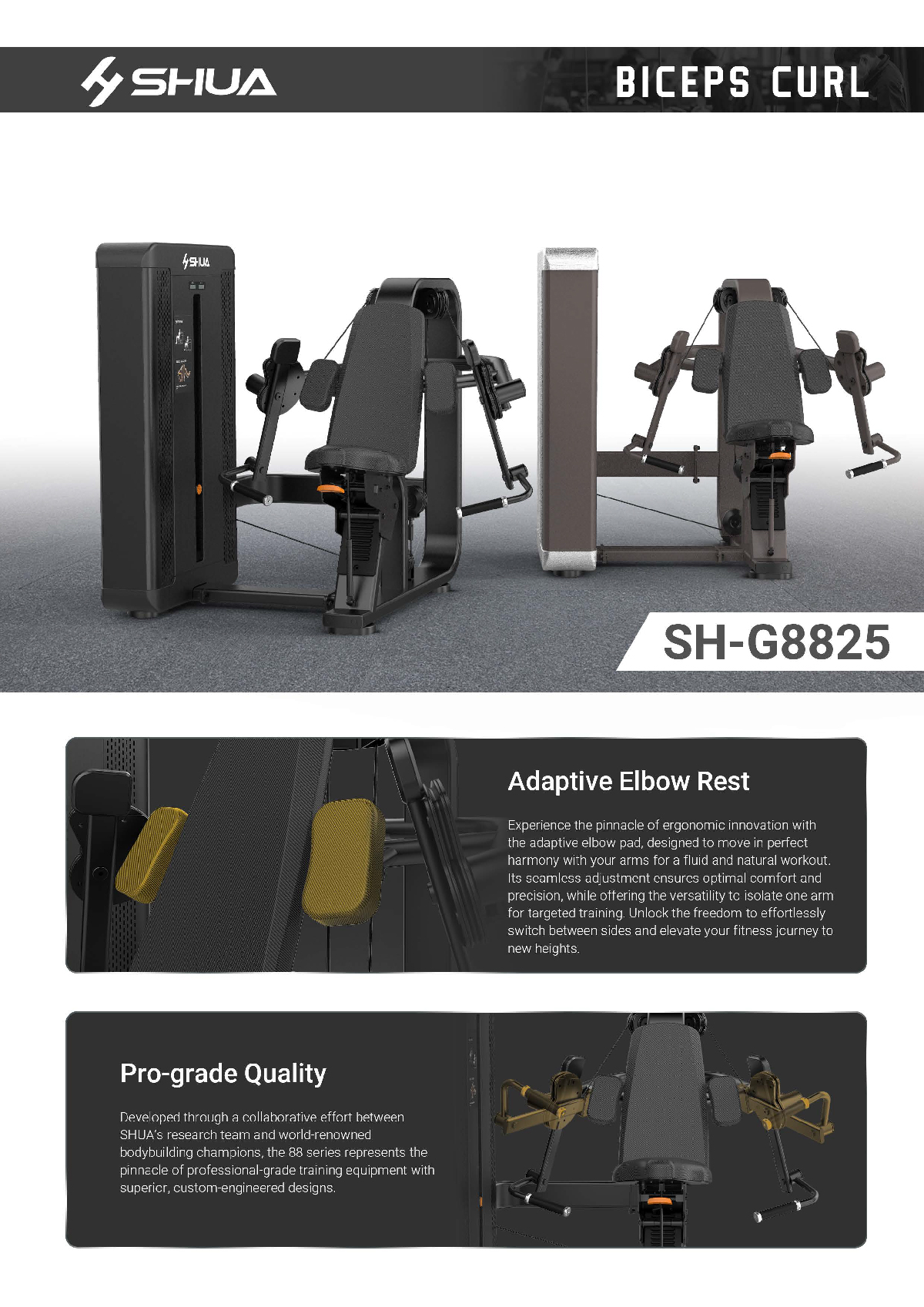 SH-G8825 Biceps Curl มาพร้อมดีไซน์สีดำล้วนอันโฉบเฉี่ยว ออกแบบมาเพื่อการออกกำลังกายต้นแขนอย่างมีประสิทธิภาพ แผ่นรองข้อศอกแบบปรับได้จะปรับตามการเคลื่อนไหวของแขนได้อย่างราบรื่น ทำให้การยกน้ำหนักแต่ละครั้งราบรื่นและเป็นธรรมชาติยิ่งขึ้น ผสานกับด้ามจับแบบหมุนได้ ดีไซน์นี้มอบความสะดวกสบายสูงสุดและการใช้งานกล้ามเนื้อได้อย่างเต็มที่โดยไม่เกิดแรงตึงจนเกินไป